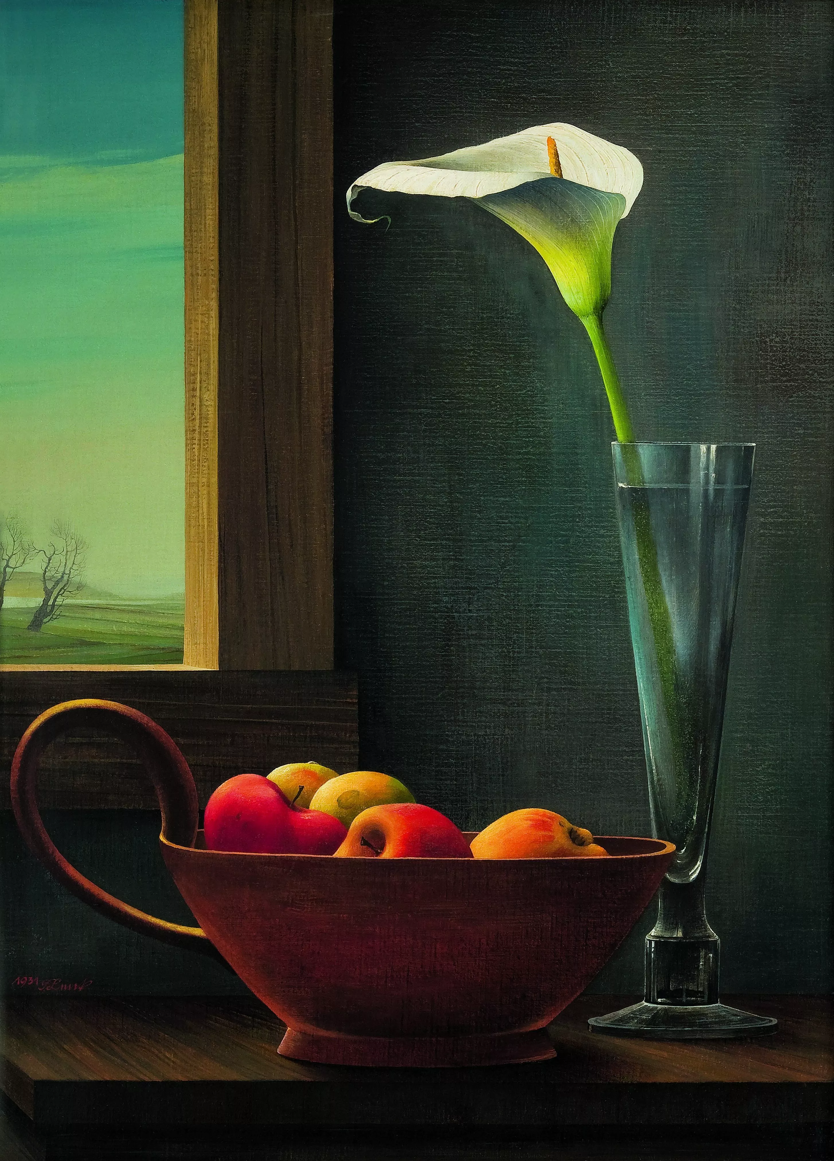 Lenk trennte streng zwischen dem monumentalen Stillleben in der Nähe und der in weite Distanz gerückten Umwelt. Die Flusslandschaft liegt weit entfernt, nur winzige Figuren sind am Ufer zu erkennen. Auf der gegenüberliegenden Seite verschwinden die Häuser im Nebel.