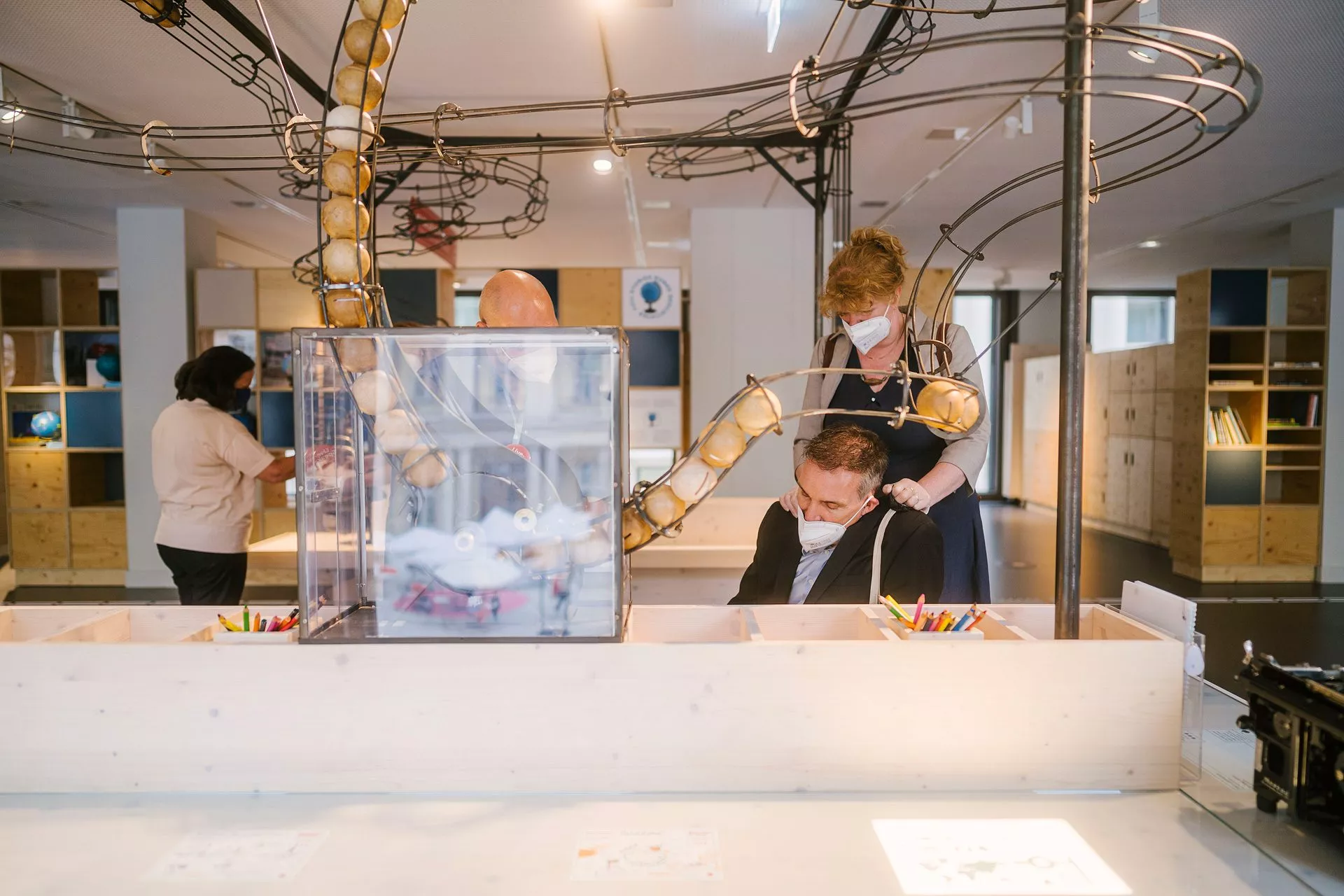 Der fast bis unter die Decke reichende Kugelkartograph überrascht. Was aussieht wie eine abenteuerlich gebaute Kugelbahn, ist zugleich ein Kartenarchiv.