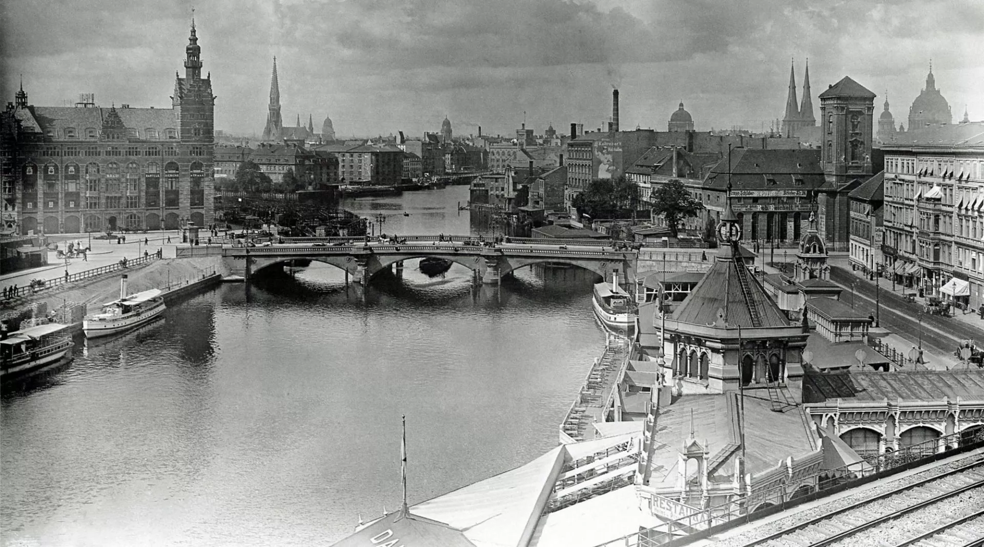Breite Gehwege auf beiden Seiten der großzügig bemessenen Fahrbahn laden dazu ein, auf der Waisenbrücke über die Spree zu spazieren oder auf halbrunden Balkonen unter kunstvoll verzierten Straßenlaternen zu verweilen. Von hier schweift der Blick über den Fluss und das geschäftige Treiben am Hafen nach Alt-Berlin mit seinen Dächern, Türmen und Kuppeln.