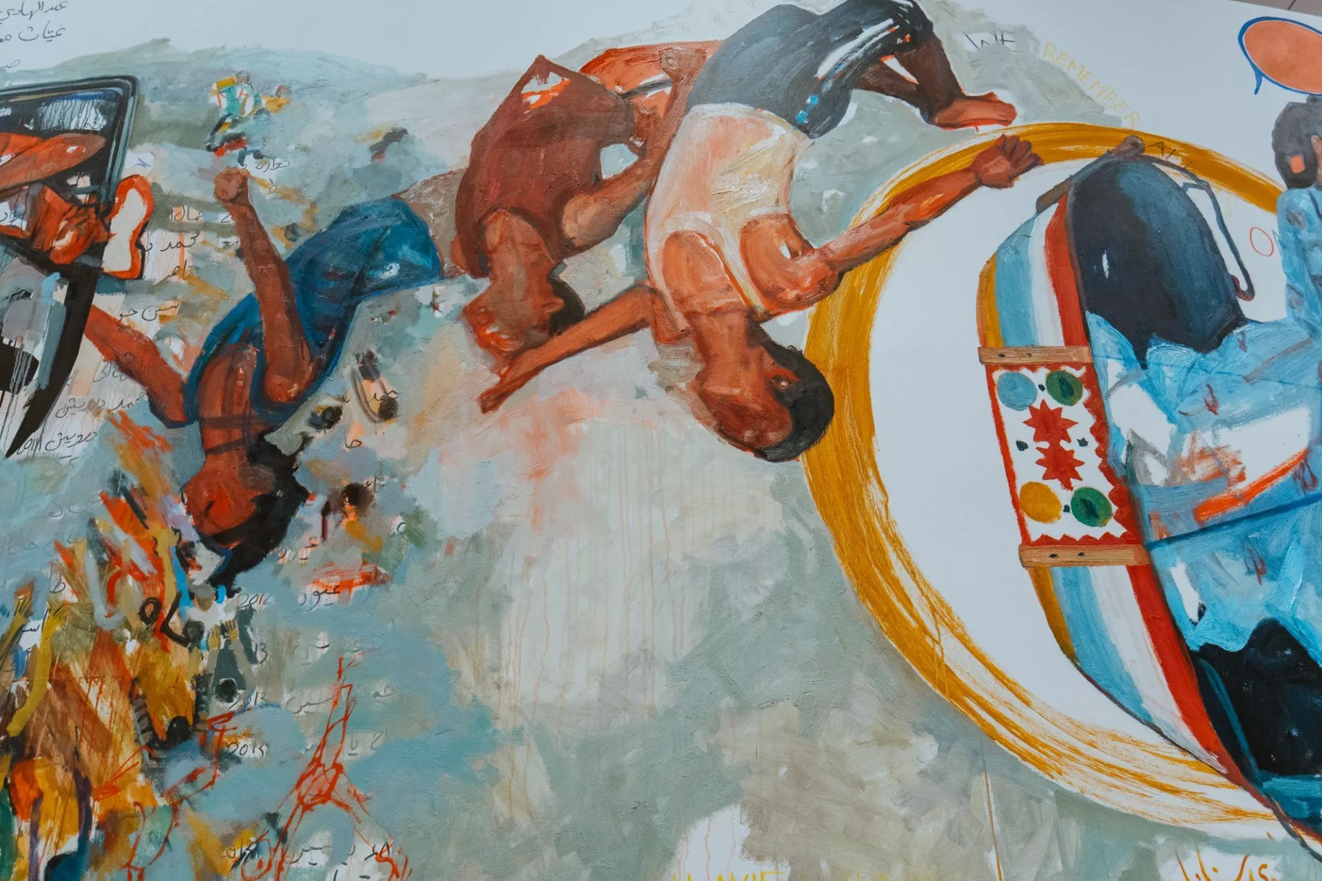 Das Wandgemälde verbindet Darstellungen aus der altägyptischen Mythologie mit Szenen von Protesten auf dem Tahrir-Platz in Kairo (2011) und Aussagen von Aktivist:innen.