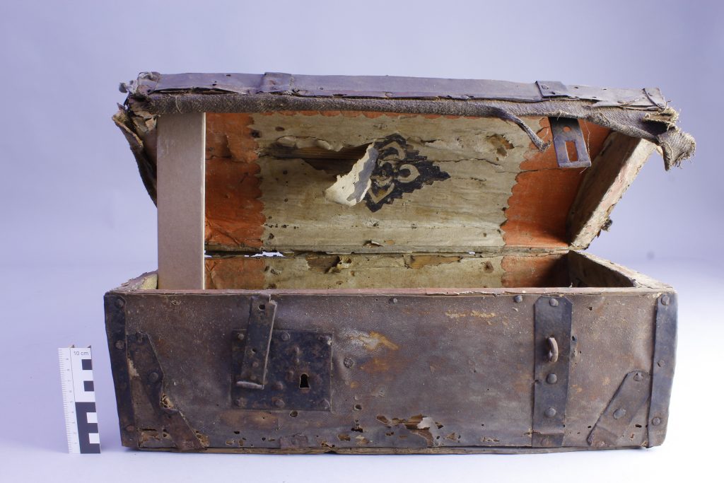 Als Tiefenuntersuchung des Objektes, insbesondere verdeckter Bereiche, wurden Untersuchungen mittels Röntgenstrahlung durchgeführt, die Aufschluss über die Konstruktion, Herstellungsweise und vorhandene, möglicherweise verborgene Bestandteile geben sollten. Die Auswertung der Röntgenbilder ergab ein aufschlussreiches Bild über die Vielzahl der verwendeten Metallelemente wie Beschläge oder Nägel. Die Diversität der Nägel und ihre Herstellung durch Schmieden wird ersichtlich. Schäden sowohl an den metallischen Bestandteilen als auch in der Metallsubstanz selbst liegen in geringem Maß vor. Ebenso ist die Holzstruktur der überwiegend verdeckten Wandungsbretter zu erkennen.Die Untersuchung der Objektoberfläche unter Einsatz von ultravioletter Strahlung erfolgte mit einer UV-Handleuchte im Bereich von 365 Nanometer. Die Reaktion in Form von Fluoreszenz bzw. Photolumineszenz wurde fotografisch festgehalten. Im Vordergrund der Untersuchung steht die Differenzierung von Materialien durch charakteristische Fluoreszenz. Hierbei konnten diverse Details sichtbar gemacht werden wie beispielsweise der Unterschied zwischen zwei Siegeln roter Farbe, der Hinweise auf die Siegelmasse Wachs (rechts) oder Lack (links) gibt.