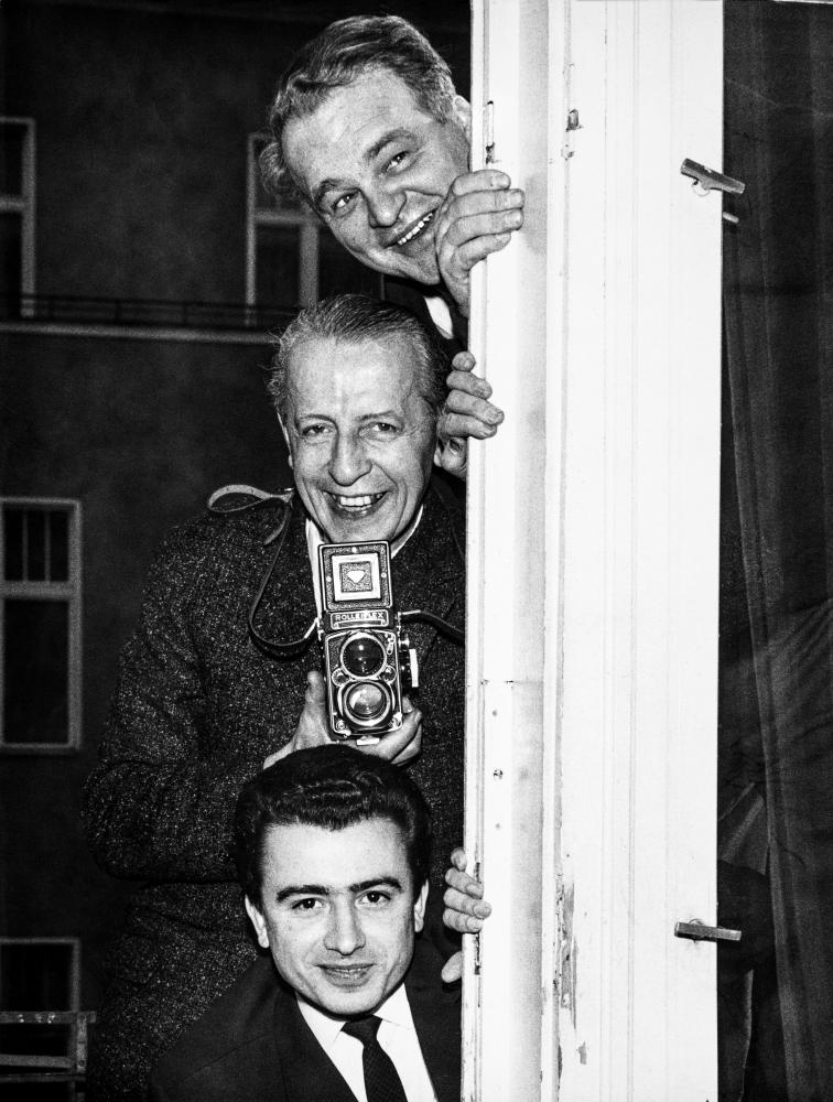 Harry Croner (Mitte) mit seiner Rollei-Kamera, Berlin 1960