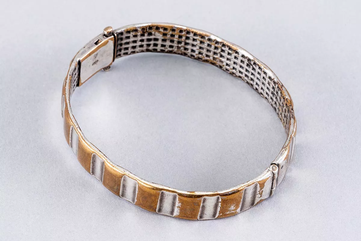 Der hier vorgestellte Armreif kam im September 2017 als Schenkung in die Sammlung des Stadtmuseums Berlin. Er besteht aus einem Granatführungsring mit einem Scharnier und Schnepperschloss. Der Verschluss ist mit dem Firmenlogo „KJAG“ und dem Deutschen Reichs-Gebrauchsmuster „D.R.G.M.“ gestempelt. Das Firmenlogo steht für die 1898 gegründete, in Pforzheim ansässige Firma Kollmar & Jourdan AG einen bedeutenden Hersteller von Uhren und Schmuck. Die Firma bestand trotz der Zerstörung des Fabrikgebäudes im Zweiten Weltkrieg nach dem Wiederaufbau noch bis 1975 fort.