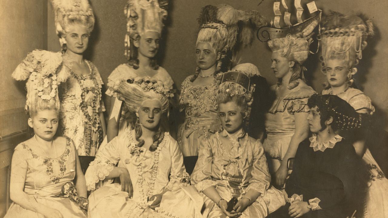 Fotografie in Passepartout mit neun im Rokokostil verkleideter Damen, Berlin, 1930 datiert (Ausschnitt)