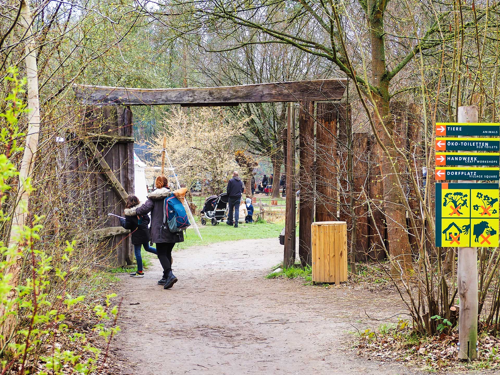 Im Außengelände greifen Info-Tafeln ausgewählte Themen der Ausstellung auf und vertiefen sie. Umfangreiche Themen-Stationen widmen sich spielerisch weiteren inhaltlichen Schwerpunkten, etwa dem Leben und der Haltung von Bienen oder Lehm als natürlichem Baustoff. Ein Wildtier-Pfad führt kleine und große Spürnasen auf die Fährte von Wildschwein, Wolf & Co., und wer genau hinsieht, kann an Hör-Stationen im Dorf einigen der Bewohner:innen aus der Ausstellung wiederbegegnen.