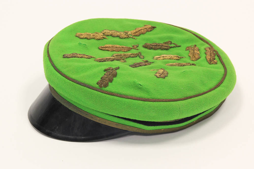Das Objekt des Monats ist eine von mehreren Mützen aus dem Nachlass der „Frankonia“. Sie vermittelt einen burschenschaftlichen Brauch. Auf dem ersten Blick erkennt man eine grüne Tellermütze mit schwarzem Schirm, die am Rand das schwarz-grün-goldene Burschenband der „Frankonia“ zeigt. Grün war seit 1910 die Mützenfarbe der „Frankonia“. Auffällig ist der Mützendeckel, denn auf ihm befinden sich mehrere scheinbar willkürlich positionierte Metallstickereien in Form eines Eichenblattes mit Eichel. Vereinzelt lassen sich auch Schlitze in der Mütze erkennen.Bei der Mütze handelt es sich um eine sogenannte Studentenmütze „mit gestickten Eichenblättern nach Landesvaterstechen“. Das Durchstechen der Studentenmützen mit einem Degen war ab dem 18. Jahrhundert ein studentischer Brauch. Anfänglich diente es dazu, die Liebe zu einem Mädchen zu zeigen. In der Folge entwickelte sich das Durchstechen der Mütze zum Freundschaftsbeweis zwischen zwei Studenten, später wurde es zu einem burschenschaftlichen Brauch: Die Burschenschaftler spießten während einer Zeremonie die Mützen auf und sangen das Studentenlied „Landesvater, Schutz und Rater“. Die durchstochenen Stellen an der Mütze wurden anschließend mit einem Weinlaubblatt oder – wie bei der hier vorgestellten Mütze – mit einem Eichenblatt bestickt.