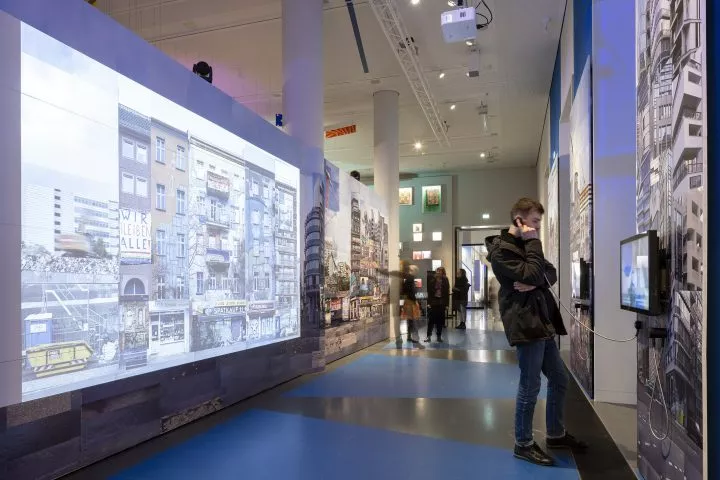 Die Freifläche „Wir bleiben! Gentrifizierung und Widerstand in Berlin“ von Barbara Bernardi, Linda Paganelli und Vincent Voignier thematisiert künstlerisch das Thema Gentrifizierung in der Ausstellung BERLIN GLOBAL. Vom 3. März 2023 bis 28. Oktober 2024 sind die Arbeiten in der Berlin Ausstellung auf der ersten Etage im Humboldt Forum zu sehen. Anhand von Interviews und einer raumgreifenden Foto- und Videocollage zeigen sie die Folgen von Gentrifizierung für Bewohner:innen, die Kulturlandschaft und den städtischen Raum.
