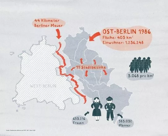 Topografie und Demografie Infografik © Sonja Hugi Ost-Berlin in Zahlen und Fakten von Sonja Hugi Jede Menge Wissenswertes über Ost-Berlin als Infografik – vom Alexanderplatz bis zum Zeiss-Großplanetarium. Mehr über Ost-Berlin Ost-Berlin-Reiseführer Sechs antiquarische Buch-Tipps für Ihren nächsten Flohmarkt-Besuch!Artikel, 4 min Lesezeit Ost-Berlin damals & heute Bilder von Rolf Goetze aus dem Ost-Berlin der 1970er und -80er Jahre im Vergleich mit heute.Short-Story, 3 min Lesezeit Die Greifswalder Straße Eine fotografische Bilderstrecke dokumentiert die Ost-Berliner Hauptverkehrsstraße, wie sie um 1981 aussah. Heutige Bilder zeigen, was sich seither verändert hat.Short-Story, 3 min Lesezeit Auf Schienen durch Ost-Berlin Begleiten Sie uns auf einer filmischen Entdeckungsfahrt mit der Straßenbahn, die Sie durch das vergangene Ost-Berlin und die heutige Stadt führt.Short-Story, 3 min Lesezeit DDR-Ampelmännchen im Museum Ephraim-Palais © Stadtmuseum Berlin BerlinZEIT Die Stadt macht Geschichte!Mehr über Ost-Berlin erfahren Sie auch in der großen Ausstellung im Museum Ephraim-Palais. Zur Ausstellung Mehr Berlin-Geschichten Ost-Berlin Berliner Mauer 20. Jahrhundert Alltagskultur