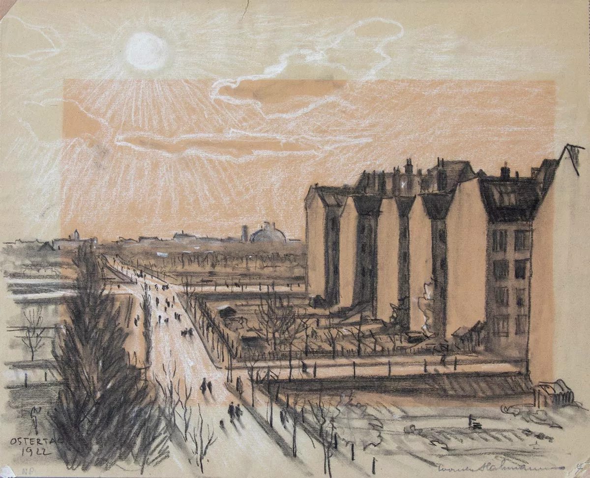 George Grosz wohnte ab April 1912 in der Lichterfelder Straße im Steglitzer Vorort Südende. In zumeist sparsam angelegten Blättern wie diesem zeichnete er sein neues Wohnumfeld. Oft zeigen seine Arbeiten einen als öde charakterisierten Vordergrund und eine zurückgesetzte städtische Szenerie. Die geschlossene Bebauung in „Wohnhäuser in Südende“ dokumentiert die zunehmende Verstädterung der ehemaligen Villenkolonie.