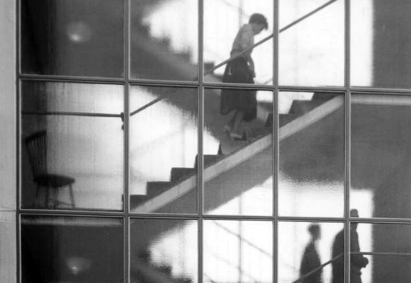 Treppenhaus eines der heute für das Hansaviertel typischen Hochhäuser, die nach 1945 anstelle der im 2. Weltkrieg zerstörten Gründerzeitviertel errichtet worden sind, 1957.