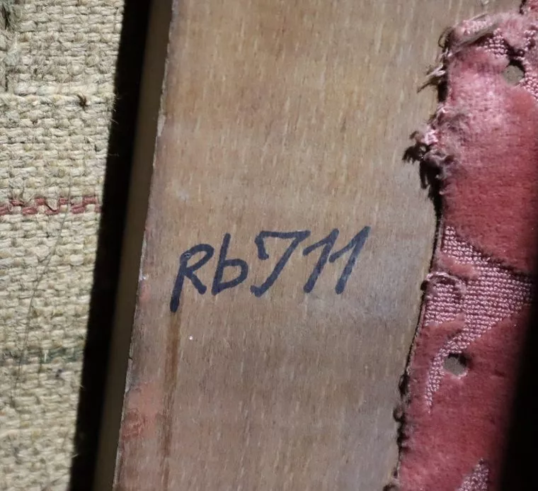 Rückansicht eines Sofas mit der handschriftlichen Nummer Rb 711 auf einer Holzleiste