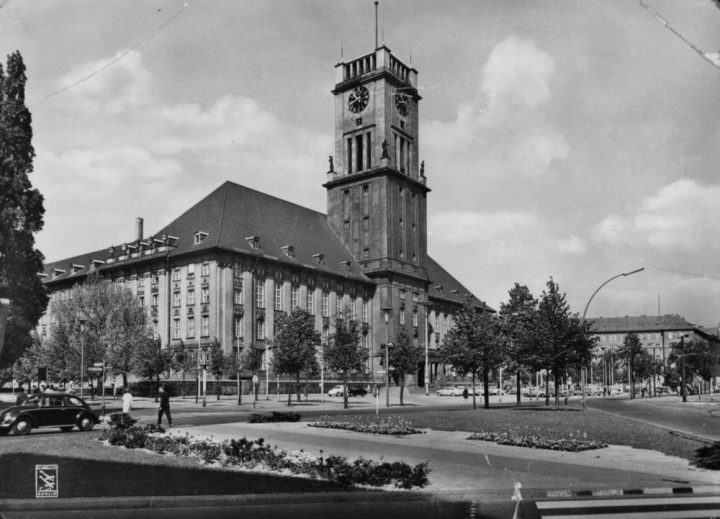Rathaus Schöneberg, Foto-Postkarte, ca. 1962-66. Nach der Teilung Berlins durch die Berliner Mauer hatten hier das Abgeordnetenhaus und der Senat West-Berlins bis zur deutschen Wiedervereinigung 1990 ihren Sitz.