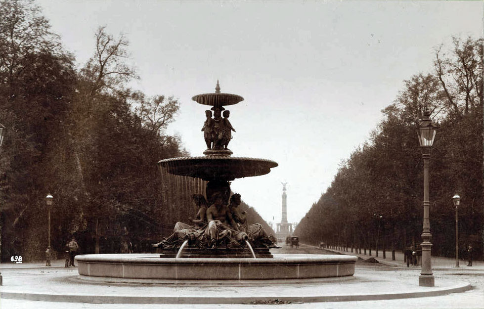 Der Wrangelbrunnen am Kemperplatz, Tiergarten, 1889. Blick über die Siegesallee nach Norden zur Siegessäule, damals noch vor dem Reichstag. Ungefähr hier befindet sich heute die Einfahrt zum Tiergartentunnel. Der Brunnen ist nach dem preußischen Generalfeldmarschall Friedrich von Wrangel benannt. Eingeweiht am 22. März 1877, wurde er 1901 abgebaut und nach Kreuzberg versetzt (Grimmstraße, Einmündung Urbanstraße).