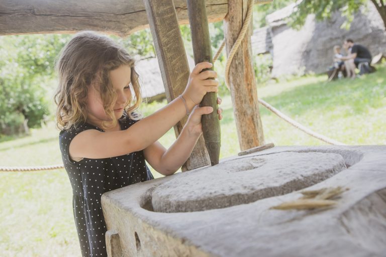 Auf ihrem Rundgang durch das mittelalterliche Dorf vollziehen die Kinder den Weg vom Getreide zum Brot nach: Sie erproben den Pflug, benutzen den Dreschflegel und mahlen Korn mit der Handmühle.