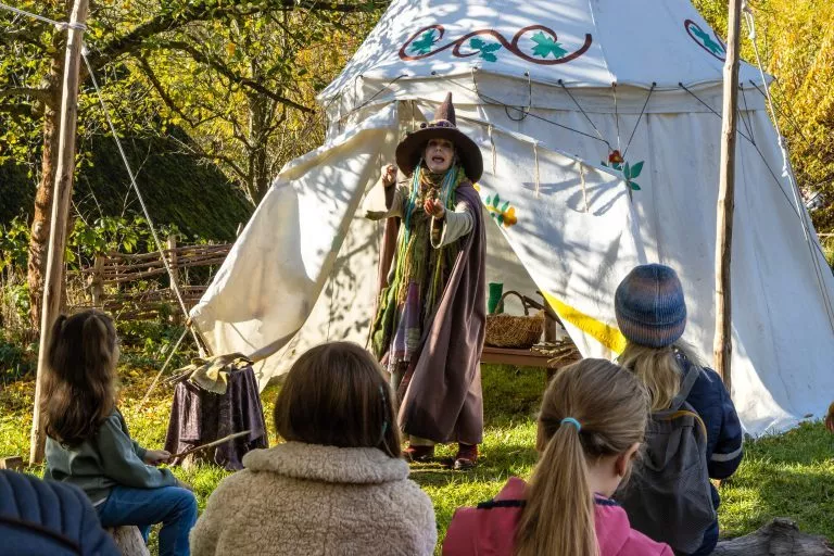 Die Märchenhexe Silberzweig oder der Gaukler Astor Ytellar erzählen das Grimm’sche Märchen „Frau Holle“. Mit ihrer Zauberspindel nehmen sie die Jungen und Mädchen mit auf eine Reise durchs Museumsdorf.