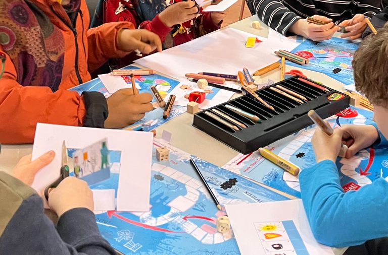 In diesem Kreativ-Angebot erkunden Teilnehmer:innen aller Altersgruppen gemeinsam den Schulalltag vor und nach dem Fall der Berliner Mauer.