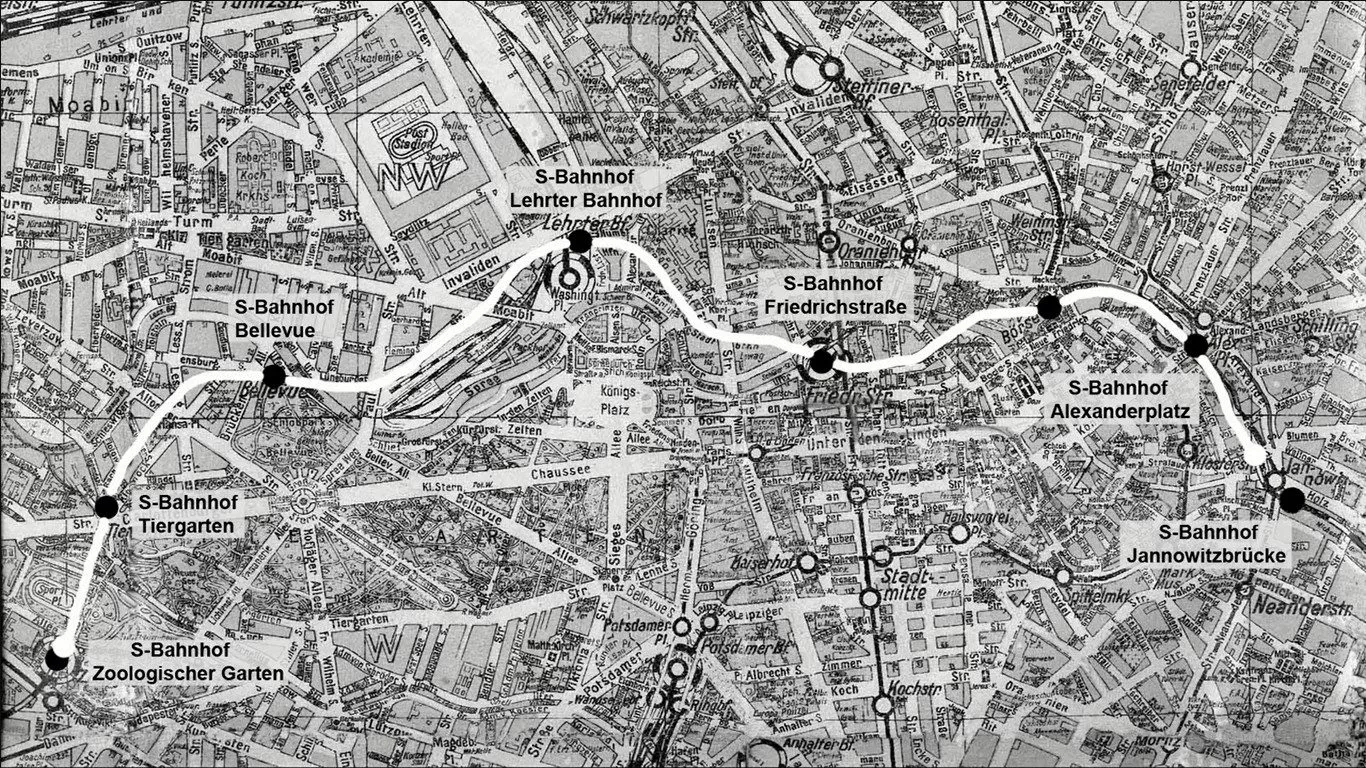 Die Fahrtstrecke auf der Stadtbahn vom Bahnhof Jannowitzbrücke bis zum Bahnhof Zoo.